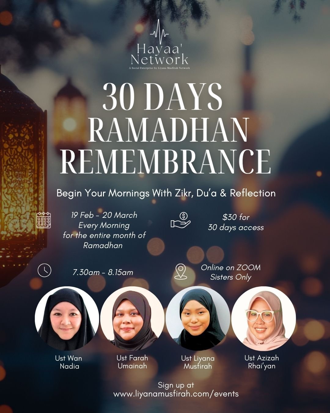 30 Days Ramadhan Remembrance Thursday, February 19, 2026 7:30 AM Friday, March 20, 2026 8:15 AM Google Calendar ICS Click here to buy ticketsSell tickets online with Ticket Tailor
